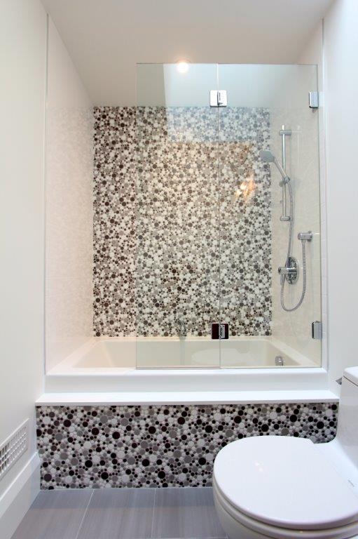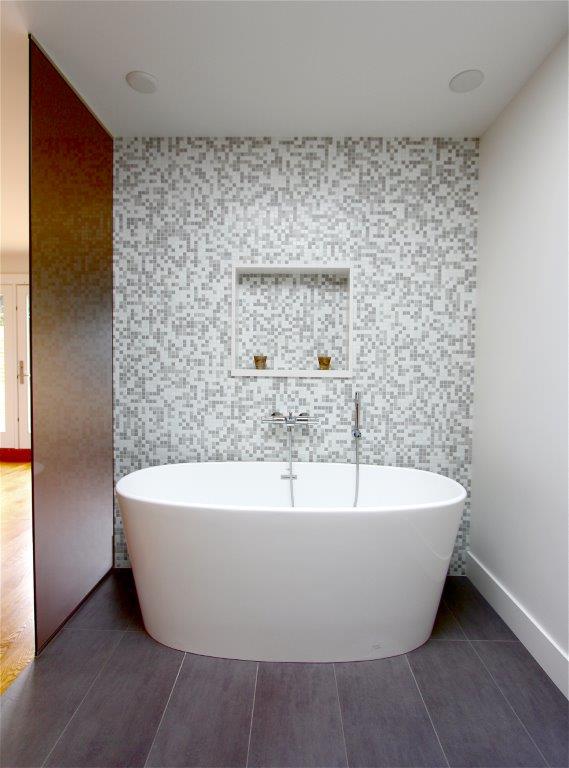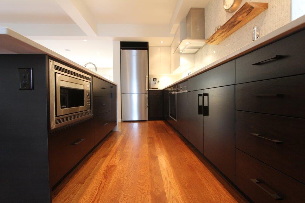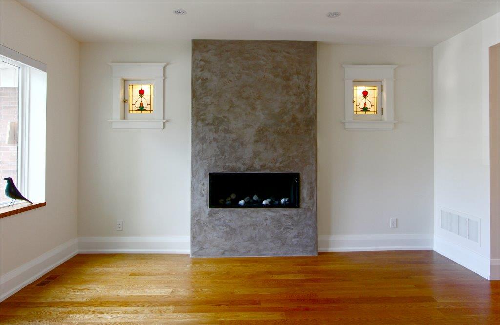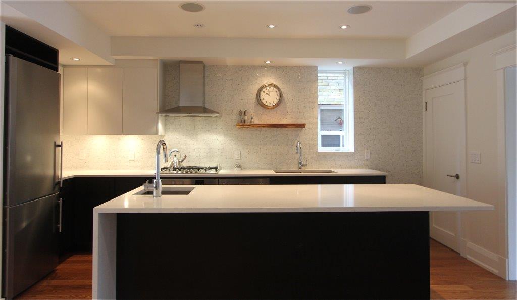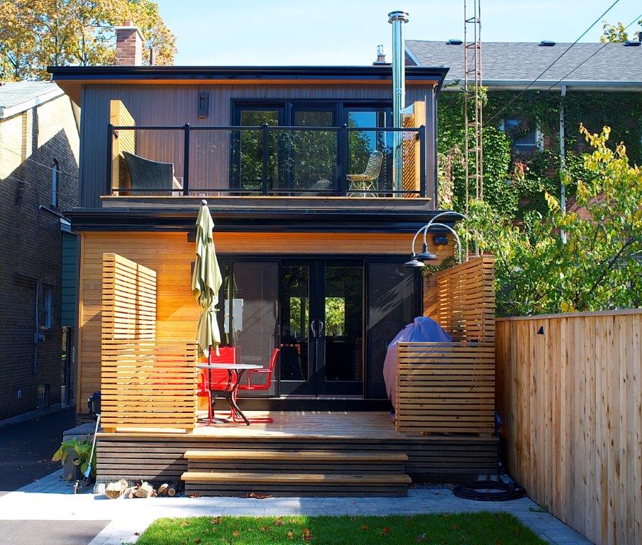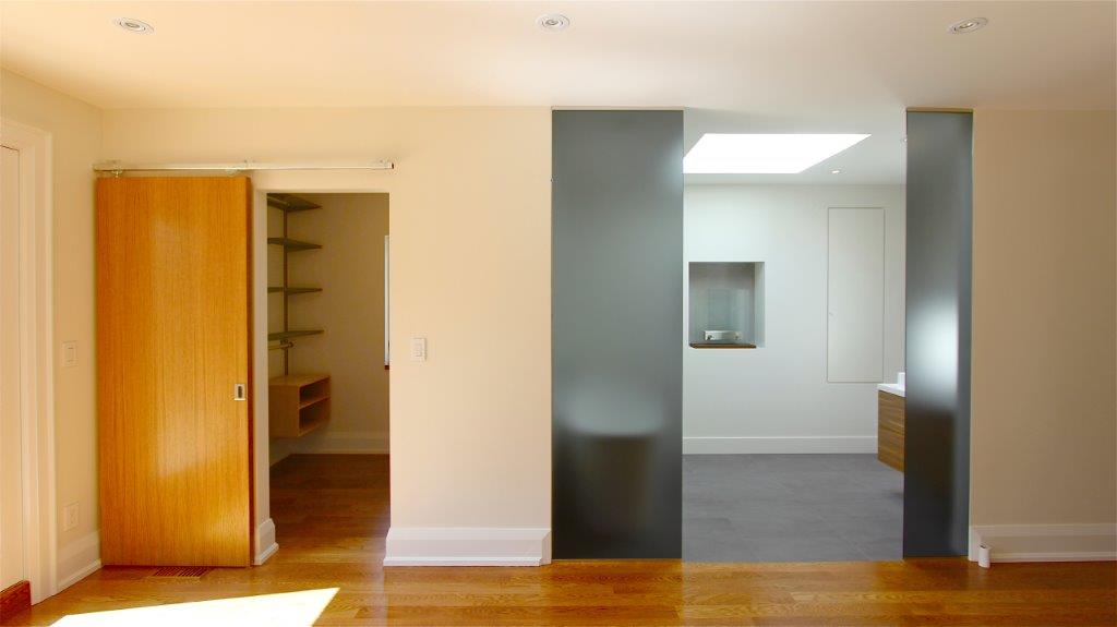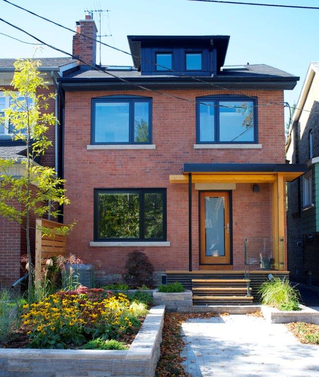 This is the contemporary renovation and rear second floor addition to a two storey, detached house near High Park.  The house was gutted – except for the original wood stairwell and paneled entry hall – and the basement underpinned.  The back of the ground floor was opened up to create a combined kitchen / dining / family room, with access to a new deck and the back yard.  The two children’s bedrooms on the second floor have sloped cathedral ceilings that allow for loft spaces backing onto the attic, and the master bedroom shares a fireplace with the ensuite bath.